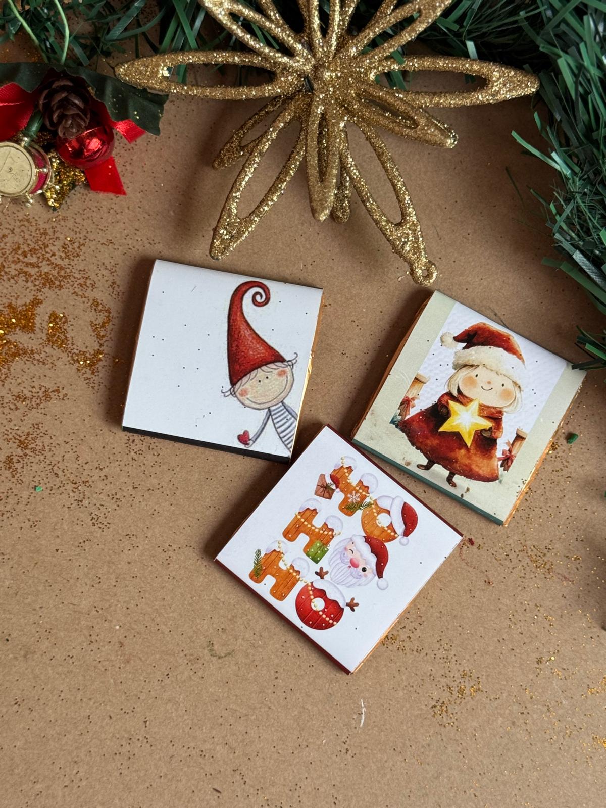 Una deliciosa tableta de chocolate decorada con envoltorios navideños ilustrados, ideales para regalar o acompañar tus celebraciones. Cada pieza viene con diseños festivos llenos de color —desde duendes y muñecos de nieve hasta renos y Papá Noel— que aportan un toque cálido y alegre a la temporada. Perfecta para sumar sabor y encanto a cualquier detalle navideño.